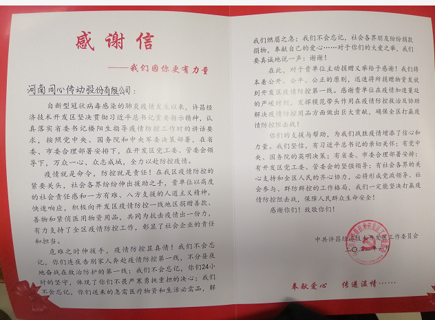 开发区党工委书记范晓东对河南MGM澳门传动股份有限公司在疫情防控的要害时期展示出的社会责任与继续体现了充实的认可和诚挚的谢谢!并送上谢谢信。
