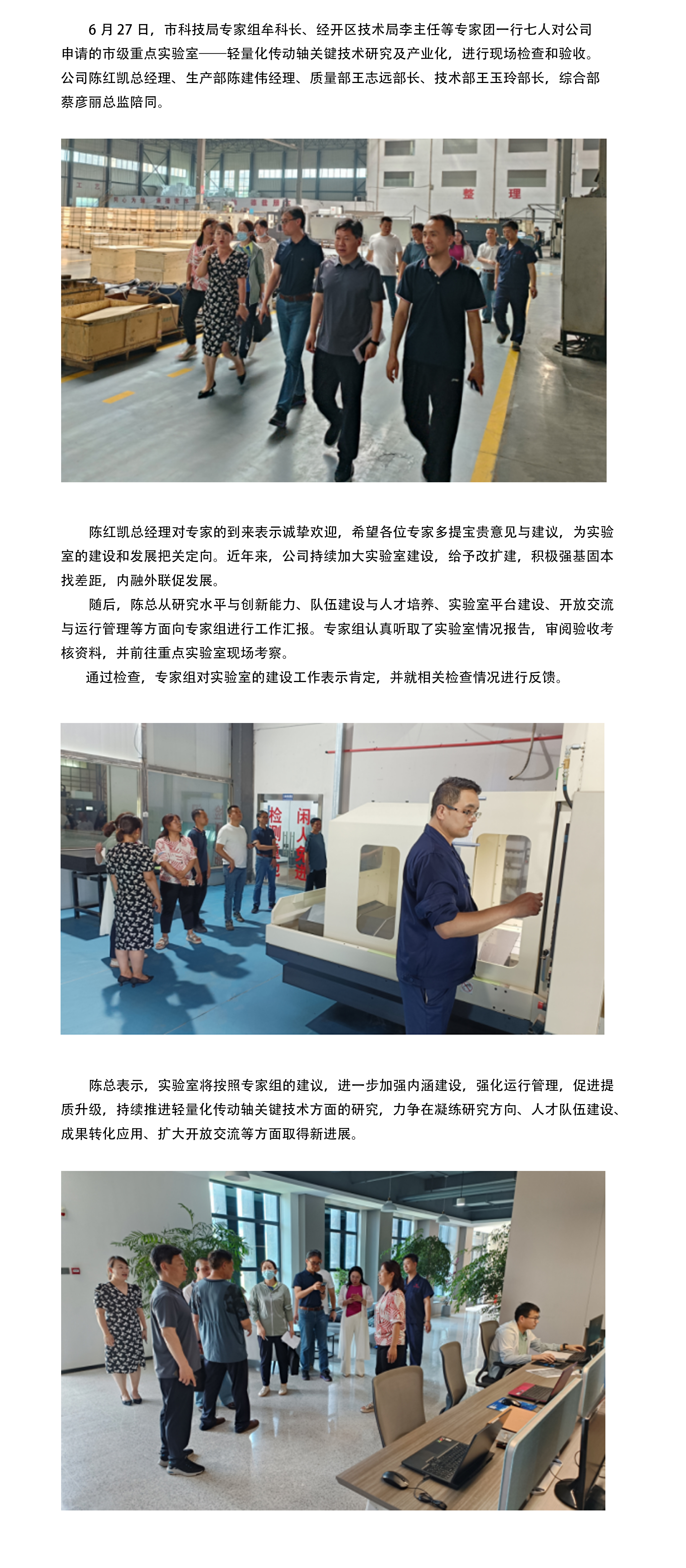 【提要描述】6月27日,市科技局专家组牟科长、经开区技术局李主任等专家团一行七人对公司申请的市级重点实验室——轻量化传动轴要害技术研究及工业化,进行现场检查和验收。公司陈红凯总经理、生产部陈建伟经理、质量部王志远部长、技术部王玉玲部长,综合部蔡彦丽总监陪同。